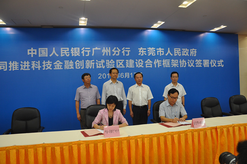 2013年6月17日,中国人民银行广州分行与东莞市人民政府签署《共同推进科技金融创新试验区建设合作框架协议》(以下简称《合作框架协议》)。中国人民银行广州分行王景武行长、李思敏副行长、丘斌副行长,东莞市委徐建华书记、市政府党组成员冷晓明同志等多位领导出席了签约仪式。《合作框架协议》签署仪式现场,东莞辖区各银行机构与企业完成21个项目的现场签约,另有112个项目在仪式后另行签约,133个项目金额共416.7亿元。