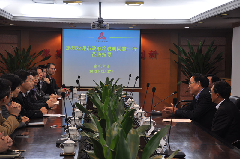 2012年12月27日,市政府党组成员冷晓明同志率有关职能部门,先后前赴东莞银监分局、中国人民银行东莞市中心支行,中国农业银行东莞分行、光大银行东莞分行、星展银行东莞分行、平安人寿东莞分公司等金融机构进行年终结算慰问。
