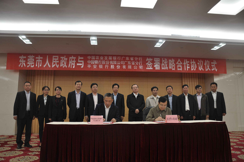 2015年12月3日下午,为进一步加强东莞与省农发行、省中行、平安银行的合作,东莞市政府在市行政办事中心举行了“东莞市人民政府与中国农业发展银行广东省分行、中国银行股份有限公司广东省分行、平安银行股份有限公司签署战略合作协议仪式”。东莞市委副书记、市长袁宝成,东莞市委常委、常务副市长张科,中国农业发展银行广东省分行行长曾绍姿,中国银行广东省分行行长谭炯,平安银行行长助理付巍,以及市有关部门、金融机构代表出席了签约仪式。